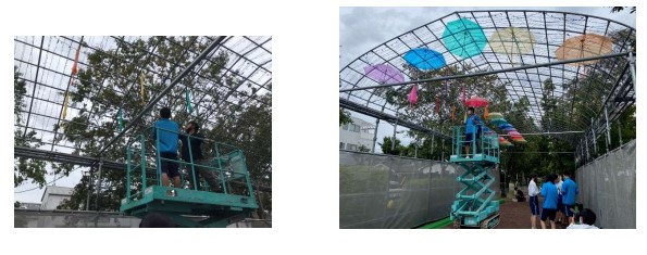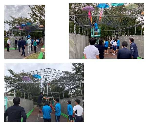 10 月 16 日、佐賀 YEG の有志と、佐賀商業高校の生徒さんで、唐人町東線(緑道)の会場 に、傘の飾り付けを実施しました。